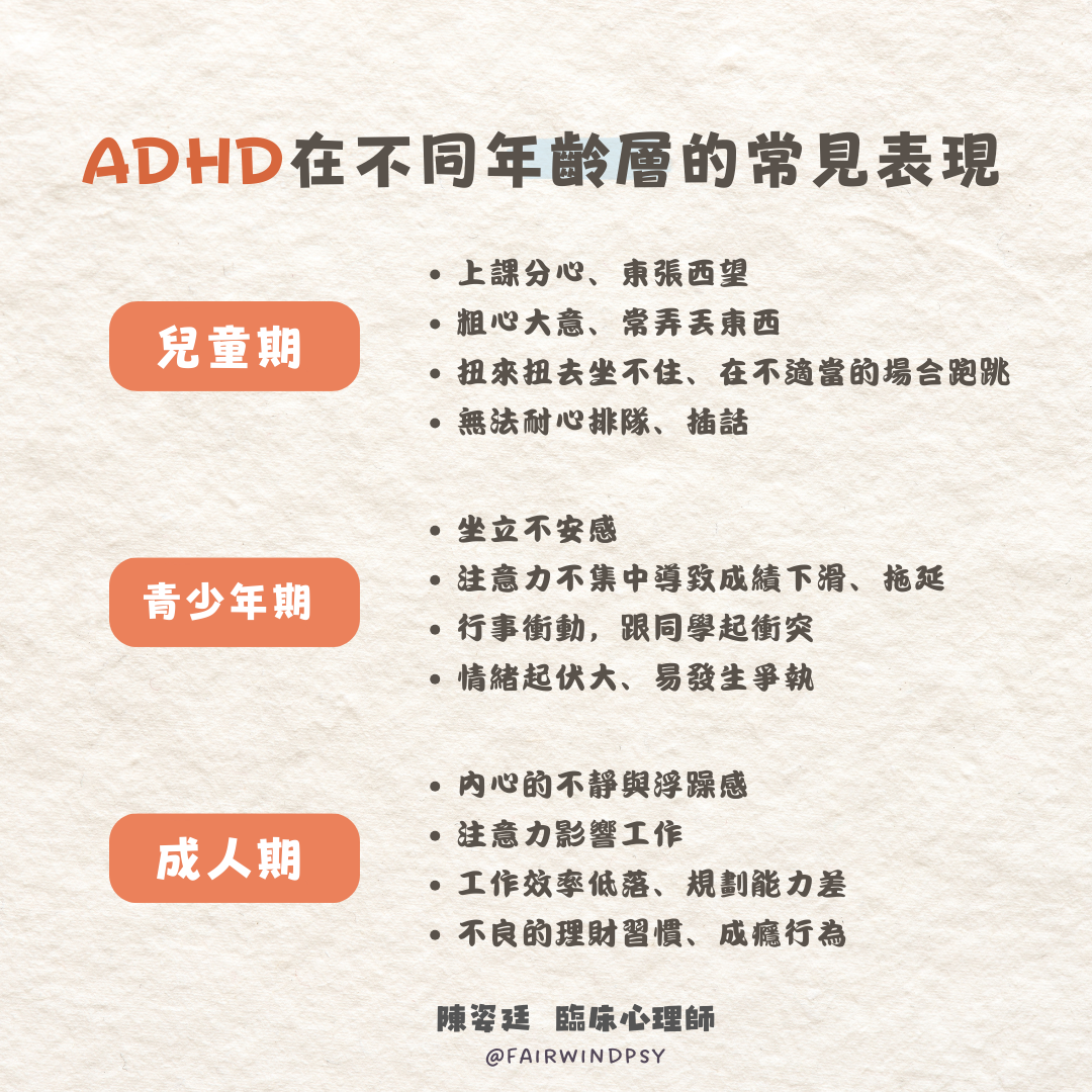 ADHD 的表現會隨著年齡增長而有所改變,並不是長大就好了。在兒童時期,我們看到的是典型坐不住、跑來跑去、衝動插話,通常行為比較「外顯」;到了青少年時期,這種外顯的行為可能會減少,轉變為內在的坐立不安、靜不下來,同時注意力不集中導致的學業問題和衝動造成的同儕衝突會更加凸顯;而進入成年期後,症狀會變得更為內化,主要呈現為工作上缺乏效率、拖延、難以規劃,以及人際關係和情緒管理上的持續困擾,那種「靜不下來」的感覺則深藏在內心,成為一種持續的焦躁感。