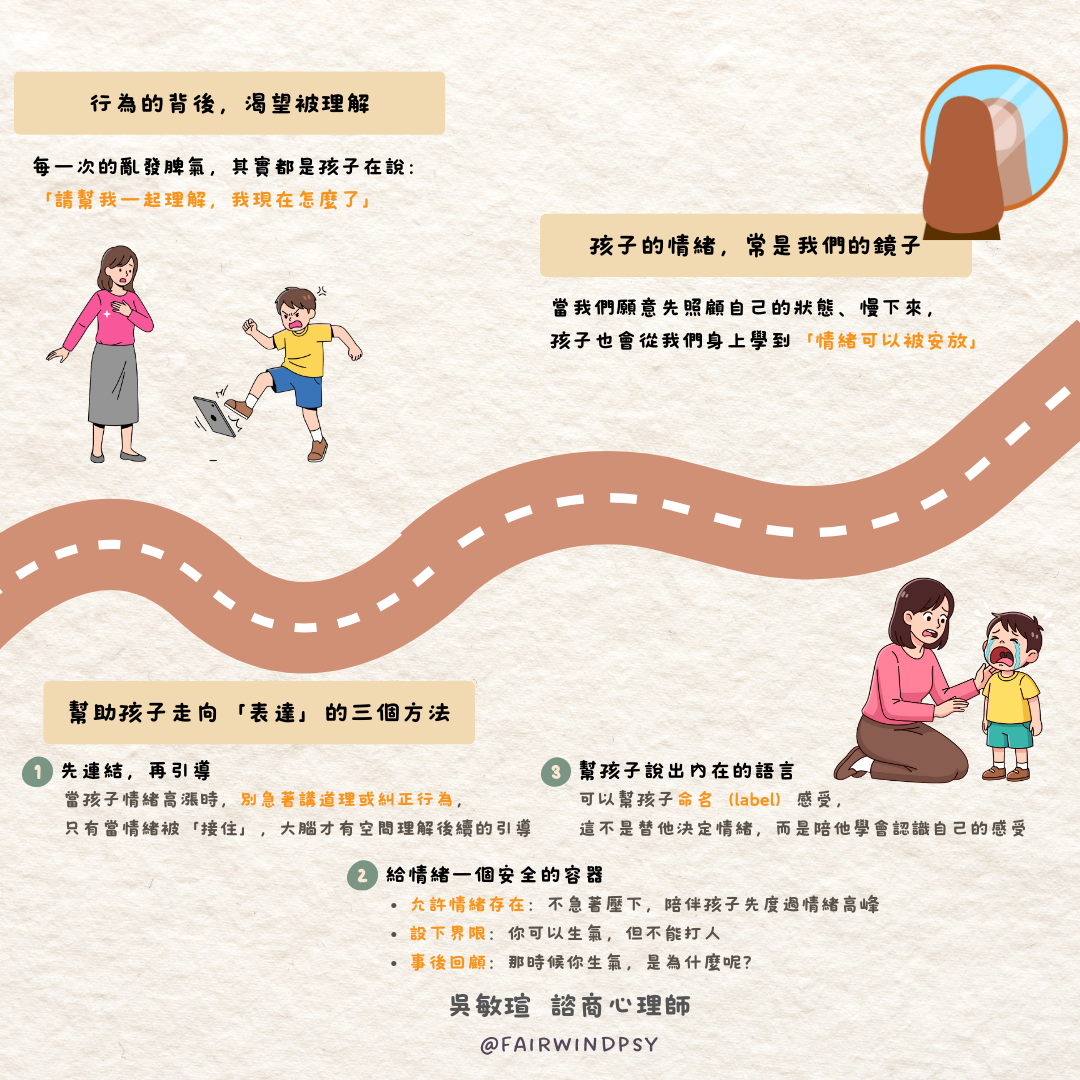 大人的任務,不是讓他不哭不鬧,而是陪他學會:「我的感覺能被看見,我可以用別的方式表達。」